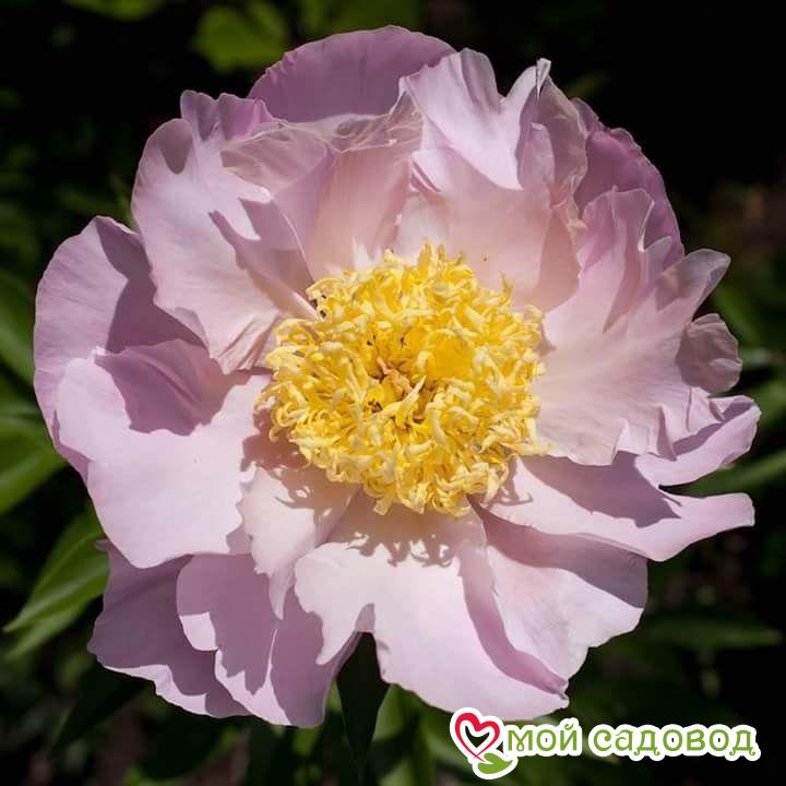 Цветок японской формы с широкими светло-розовыми лепестками, окружающими плотный шар из кружевных изогнутых стаминодий бледно-жёлтого цвета. Листва тёмно-зелёная. Стебли очень прочные. Высота 75 см. Цветение обильное, в средние сроки. Эталон качества среди ландшафтных пионов, один из самых дождеустойчивых.
